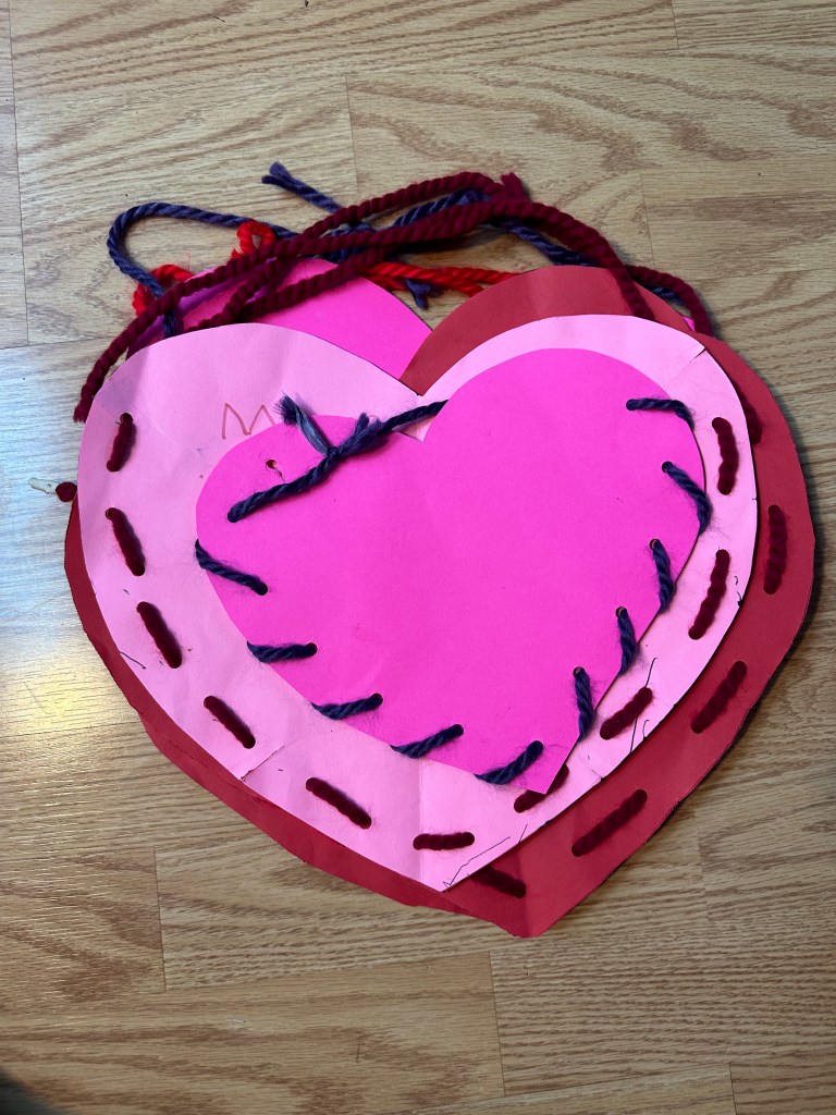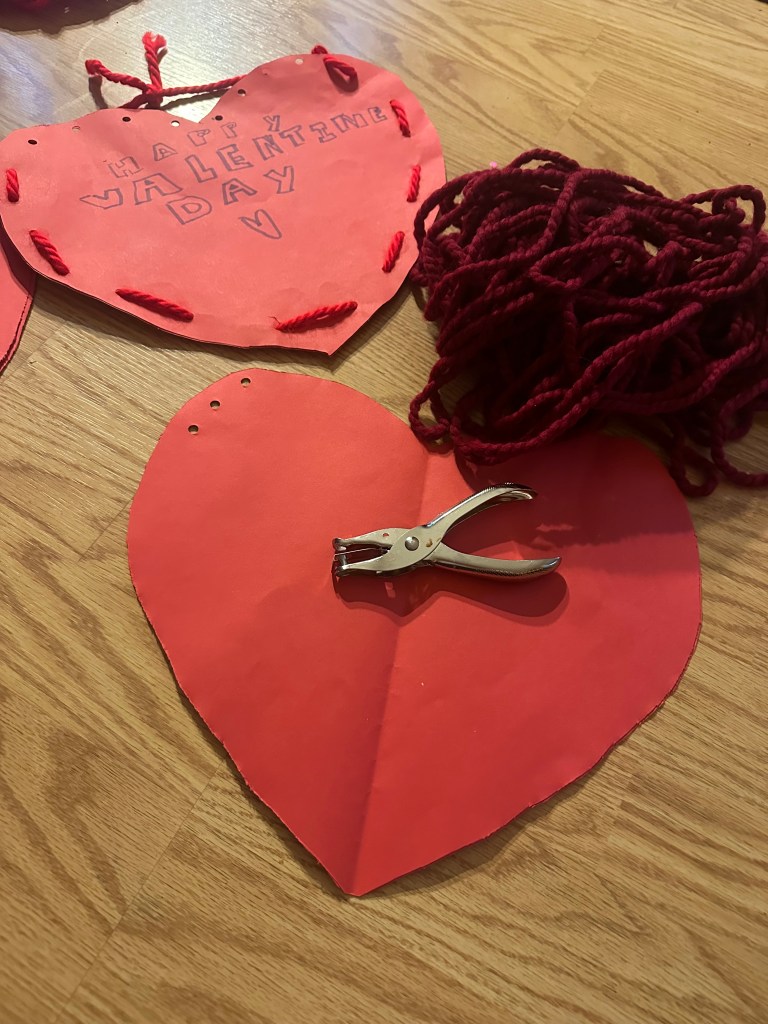 My mom is a second grade teacher and makes these super cute heart shaped bags with her students every year. I found my preschoolers were motivated to trace, cut, hole punch, lace, and decorate these Valentine’s bag with a little guidance.