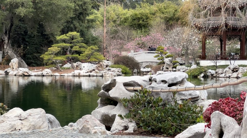 When we went at the beginning of February 2025 pink cherry blossom flowers could already be seen dotting the along lakeside path. There are many benches to sit and admire the lake’s reflections of trees and architectural elements around the garden.