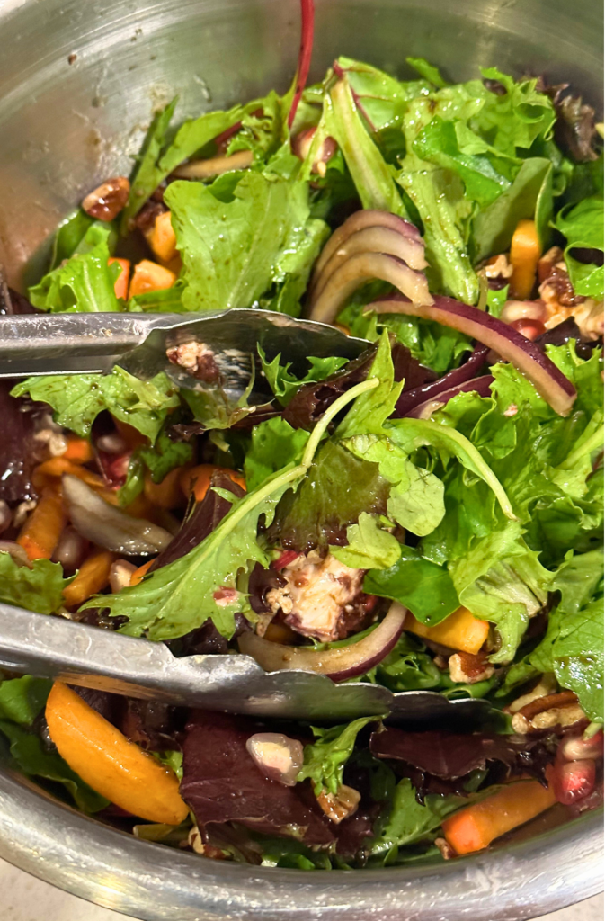 This salad comes together with a handful of fresh, colorful ingredients. Mixed greens, a crisp Fuyu persimmon, juicy pomegranate seeds, creamy chèvre, and crunchy candied pecans form the base of the salad. Olive oil and a balsamic reduction finish it with the perfect sweet-tart balance.