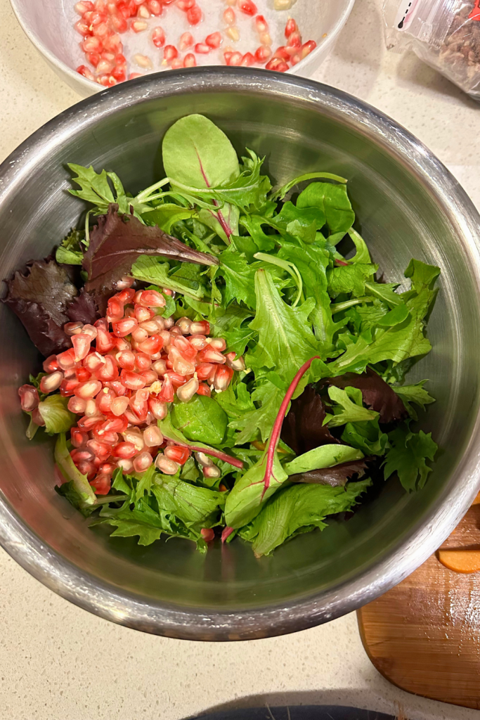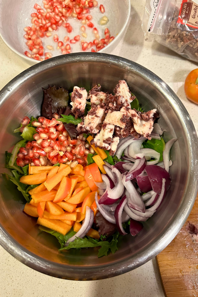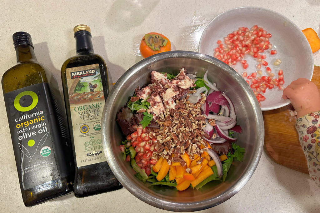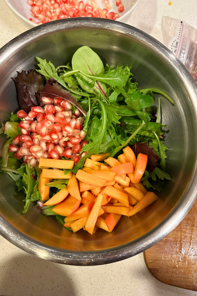 When most people think of fall food, they picture warm, heavy dishes like mashed potatoes, stuffing, and pie. Growing up in Southern California, fall always meant something different to me: crisp Fuyu persimmons, sparkling pomegranate seeds from neighbors’ trees, and fresh arugula or mixed greens straight from the garden.