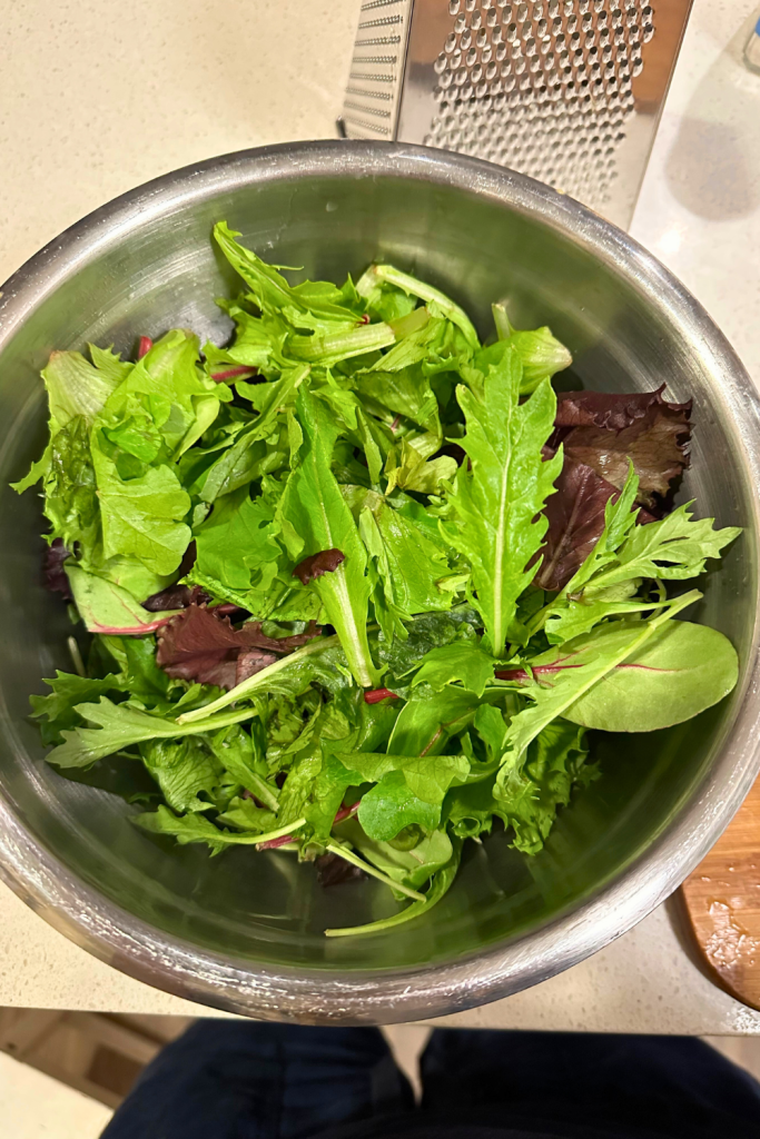 Rinse and dry the mixed greens thoroughly to keep the salad crisp. Spread them out in a medium bowl or serving platter to create the base for the toppings.