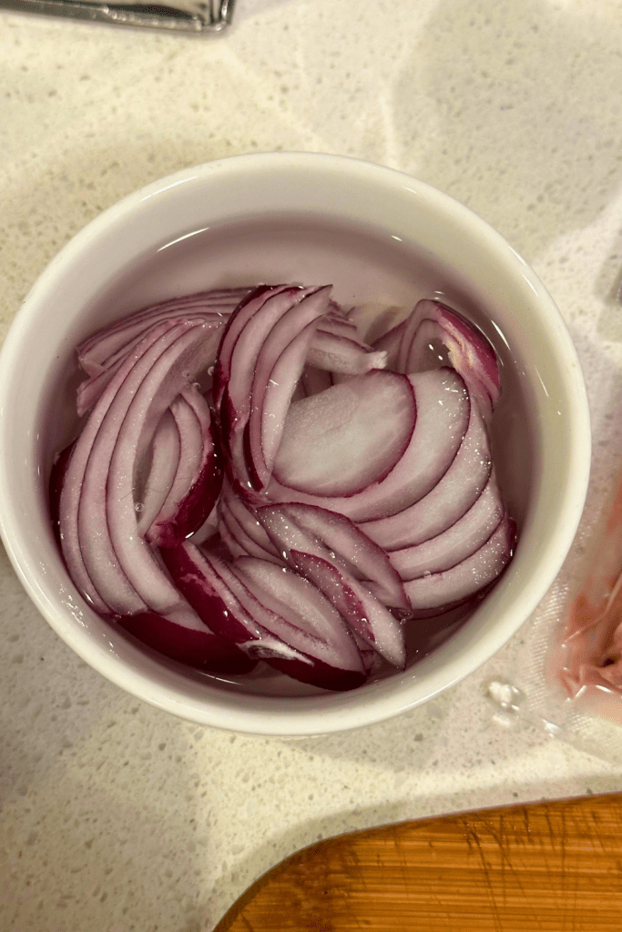 - Slice the red onion into thin slivers and soak them in water for 5 minutes to mellow their sharpness.