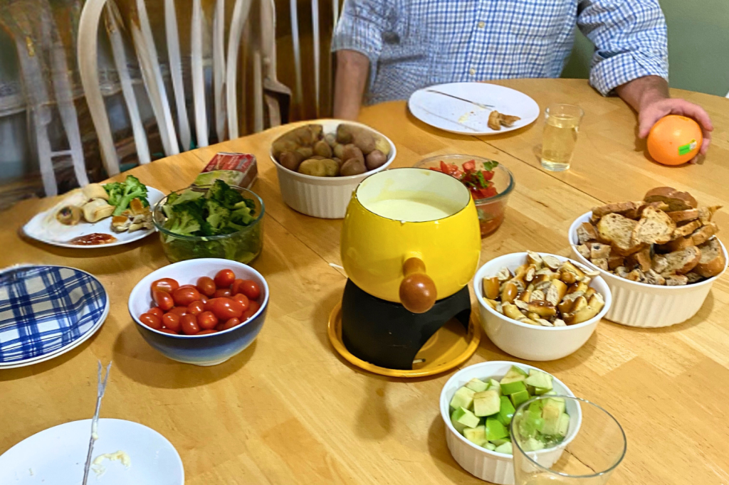 The nutty, creamy flavor of the cheese paired with the tang of wine is a lighter, savory contrast to the heavy, sugar-laden holiday food we’ve usually been enjoying since Christmas. Add in the communal experience of everyone dipping together, sampling different foods, and chatting around the table, and it’s easy to see why fondue has become such a favorite in our home.