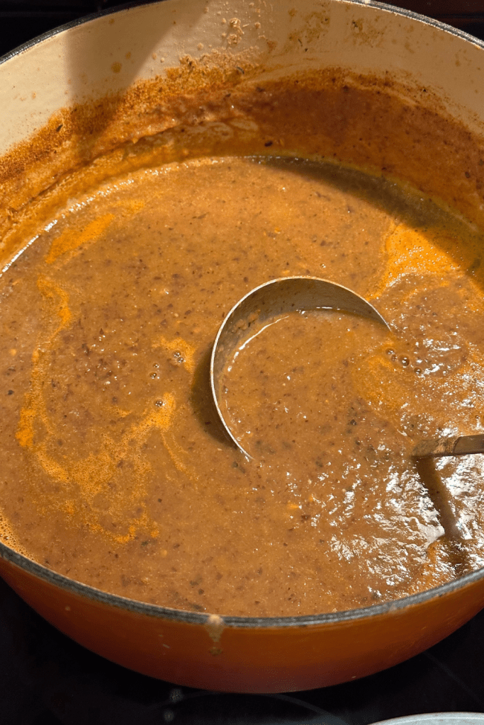 This soup can easily be made with less than 10 pantry staples. Normally I use canned pumpkin, but today I’m substituting roasted fresh pumpkin. It adds incredible depth of flavor.