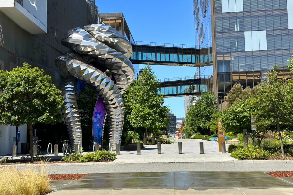 On the other side of Warriors Way, Pierpoint Lane offers a quieter, more whimsical experience. The Uber headquarters sculpture garden features Masako Miki’s playful, surreal statues set against creeping flowers and shrubs.